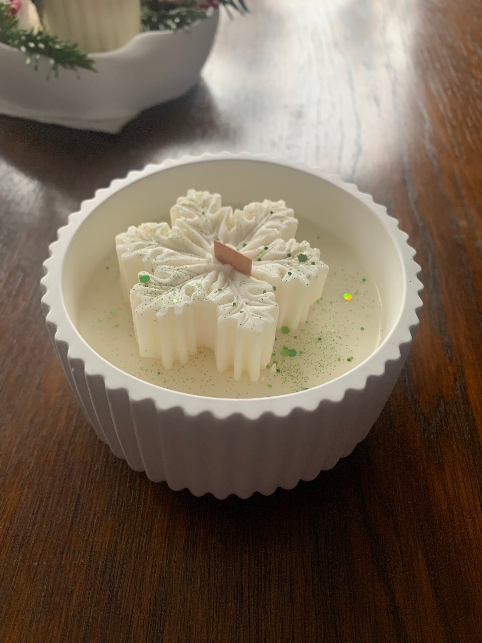 Feine grüne Glitzerakzente setzen zusätzliche funkelnde Highlights und machen jede Kerze zu einem einzigartigen Unikat. Die hochwertige Keramikschale mit ihrem wellenförmigen Rand kann nach dem Abbrennen vielseitig weiterverwendet werden – etwa als dekorative Schale oder kleines Aufbewahrungsgefäß.